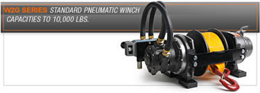 The W2G Pneumatic Series winches combine substantial pulling power with efficient performance in a versatile, compact package. Select models are rated to pull up to 10,000 pounds on a single line, and reach maximum speeds up to 23 feet per minute on the full drum.