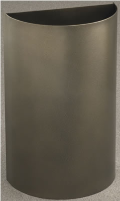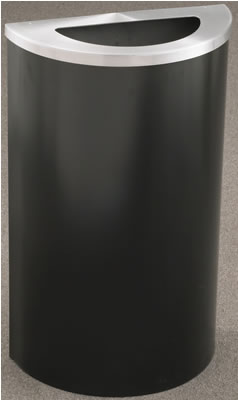 Large Capacity 24" wide half round waste and ash/trash receptacles are perfect for busy pedestrian traffic areas. Top opening models have a 29 gallon capacity while side opening models have a 24 gallon capacity. These units are ideal for use in rest rooms, corridors, entrance and exits, vending machine areas, health clubs, by elevators, in hallways, against columns, and other spaces that require additional trash capacity.