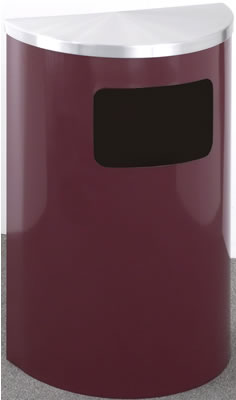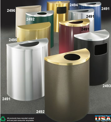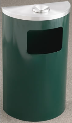 These space-saving half round waste and trash recep- tacles are the product of choice for use against walls and partitions. Manufactured with steel and aluminum, these fire-safe, half round, waste receptacles feature rustproof aluminum bottoms and full width aluminum piano hinged covers. They are specifically designed to match and coordinate with the design, look, and feel of all our product lines in order to create consistency of design and finishes within any space. This line consists of five models of half round waste receptacles and one model that is an ash/trash receptacle. All products are man- ufactured in the U.S.A.