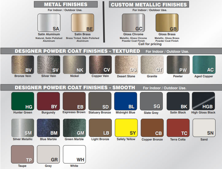 Solid aluminum models are available in clear powder coated satin aluminum (SA), or tarnish proof satin brass (BE). Galvanized steel models with aluminum covers are available in 29 textured and smooth powder coated finishes with a choice of Satin Aluminum (SA), tarnish-proof Satin Brass (BE), or a matching powder coat finish for the hand spun aluminum covers. Authentic color samples are avail- able upon request. Please keep in mind that colors shown may vary from the actual colors. An attractive customized look can easily be accomplished by choosing from the broad selection of finishes. Its easy to obtain a customized look by choosing the same or a different finish for the top and the body.